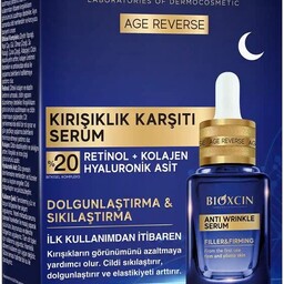 Bioxcin Age Reverse Anti-Rimpel Nachtserum is een intensief verzorgend serum ontwikkeld om de huid ’s nachts te hydrateren, verstevigen en gladder te maken. De formule bevat een anti-aging kruidencomplex, retinol, collageen, hyaluronzuur, acetyl hexapeptide-8 en palmitoyl tetrapeptide-7. Deze combinatie helpt de elasticiteit en stevigheid van de huid te verhogen, ondersteunt collageenproductie en hydrateert diep.